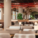 The warm textiles of the Armada Highback chair from Moroso and the Rew Loungechair from Sancal strike a distinctive contrast to the shiny copper, dark wooden panels, cool stone and matte surfaces, as seen on the specially designed lockers from HOLMRIS Customized.