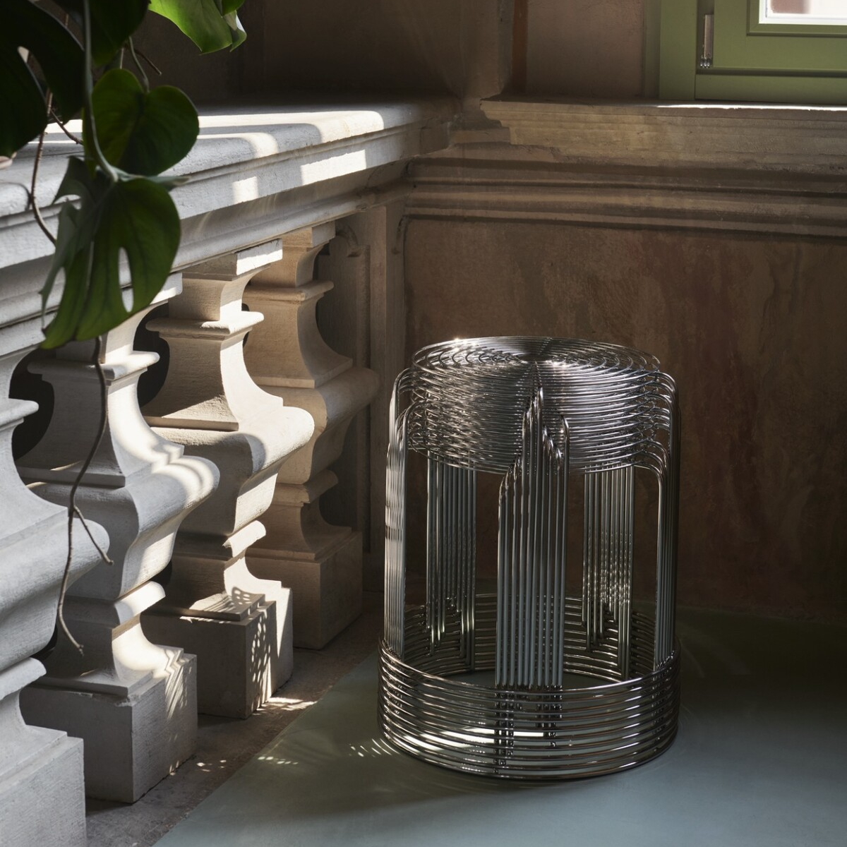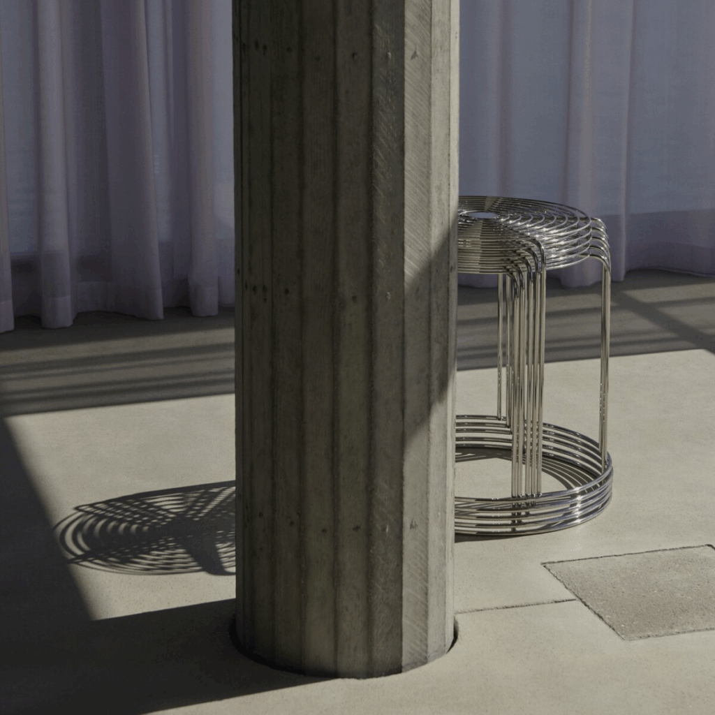 The Wire Stool from Verner Panton is a small design icon with a big presence. Made entirely from stainless steel wire, it creates a simple, geometric form that feels both light and sculptural. The airy, transparent look makes it easy to place anywhere — as a stool, a side table, or just a beautiful object in the room.