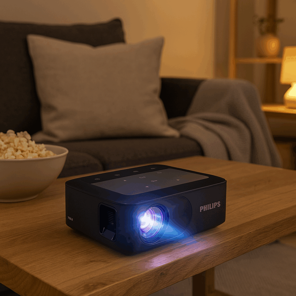 The projector has a crisp HD picture up to 65” and connects to pretty much anything, from your laptop and smartphone to Apple TV or Fire Stick. It’s simple to set up, with Wi-Fi screen mirroring, and built-in speakers. Just add popcorn.
