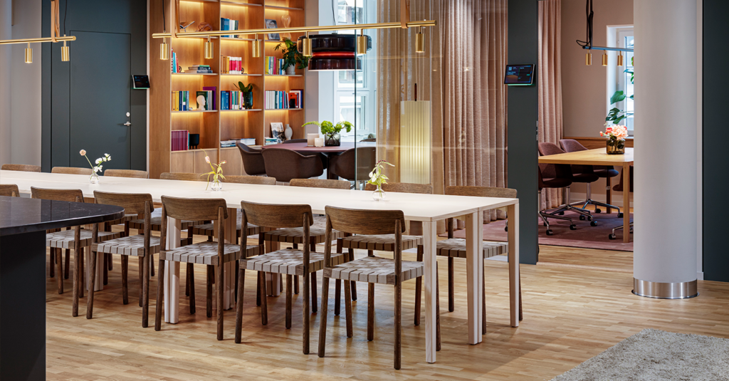 De sociale områder udgør kontorets hjerte, hvor loungeområder, fællesborde og fleksible mødefaciliteter inviterer til daglig interaktion. Træ, polstrede møbler, kunst og belysning tilfører rummet en afslappet og hjemlig stemning.