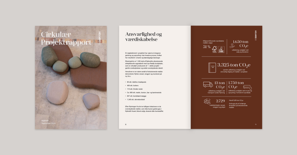 I et domicilprojekt for Nykredit blev projektets cirkulære indsatser samlet i en projektrapport med bl.a. målsætninger, faser, inventarregistrering, genbrug/upcycling, flytning, salg/donation og nøgletal for klimaeffekt.