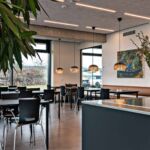 In the cafeteria, the emphasis has been placed on flexible furniture, so that the premises can also provide the setting for informal meetings or festive gatherings, such as and after work happy hour or a Christmas office party. The Stage modular boxes designed by Friis & Moltke, are used as benches that are easy to move around and can be used in different combinations. Leather cushions have been specially sewn for extra comfort.